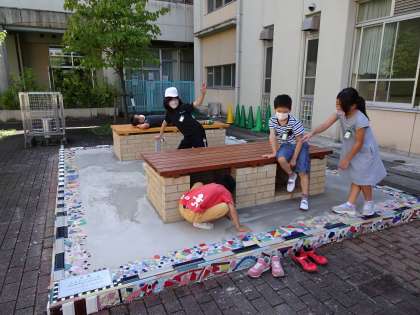 きっと、子どもたちは、お部屋に入るような感覚で使ってくれているのでしょう。くつをぬいで使ってくれることは予想していませんでしたので、少し驚きましたが、子どもたちが「かまどベンチ」の場所を大切に思ってくれているのだと感じ、とても心があたたかくなりました。みんな、大切に使ってくれてありがとう!