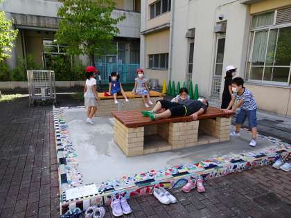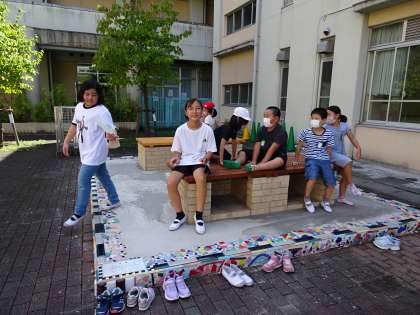 子どもたちは、「かまどベンチ」が使えるようになるのを楽しみにしてくれていました。今日(9/12)から使えるようになりましたが、中間休みに使ってくれている様子を見てみると・・・子どもたちがなぜかくつをぬいで・・・くつがならんでいます。