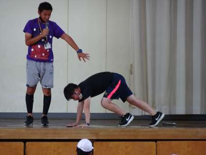 9月13日(火)5校時 体育館のステージ上のM先生とU先生・・・なにかさがしもの?
