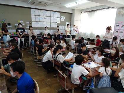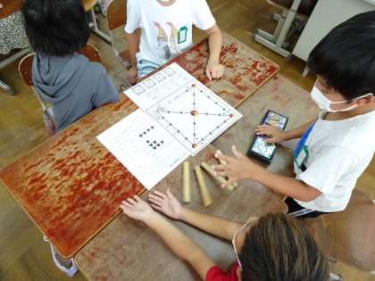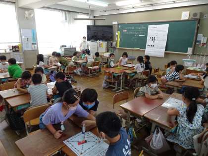 2年生は「おとなりの国のことやあそびを知ろう」の学習で、おとなりの国、韓国(かんこく)の遊び、ユンノリの遊び方を知って、グループごとにやってみました。ルールをすぐにおぼえて、みんな楽しそうでした。