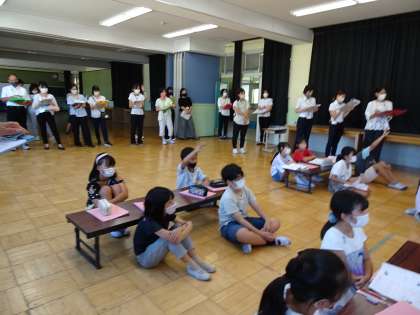 5時間目、4年4組のみんなは、本館3階の多目的室で総合的な学習の時間「深草キッズ防災プロジェクト」の学習をがんばっています。深草小学校の先生がみんな見に来ています。多くの先生が1つの学級の授業を見に来るこのような時間が、年に何回かあります。