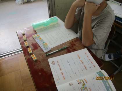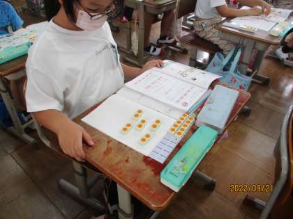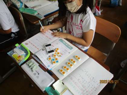 いよいよかけ算がはじまりました。「4の3つ分は4×3」「3の5つ分は5×3」というように数図ブロックを使ってかけ算とは何かから学習していきます。