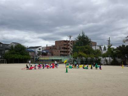 小さな子どもたちは近くの保育園の園児で、小学校の運動場を使って運動会の練習をしているのでした。みんな、がんばれ〜!