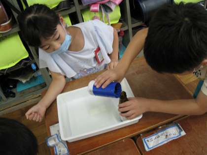 容器のかさが見た目より小さいことに、「え!こっちのほうが小さい!」など驚きながら学習を進めていました。