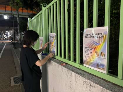 地域の皆様にも「創立150周年記念式典」を行うことをもっと知ってもらおうと、正門付近のフェンスに、N出教頭先生がポスターをはってくれました。N出教頭先生は今日も夜遅くまで、学校のためにがんばってくれていますよー!