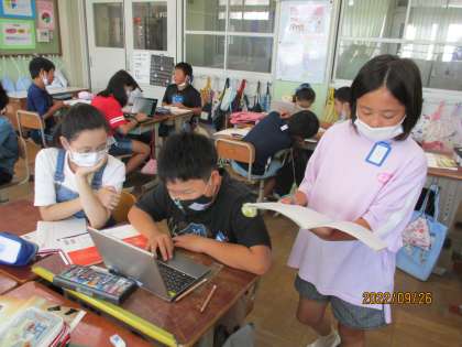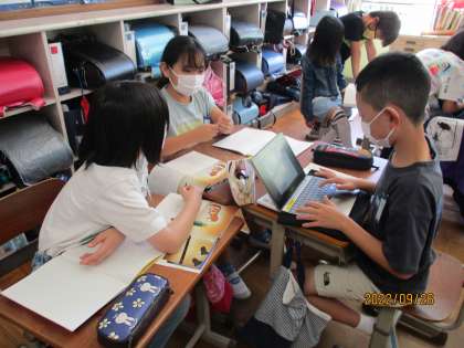 国語では「ごんぎつね」を学習しています。今日はごんぎつねの話の続きをグループで考えロイロノートでクラスで共有しました。「ごんは生き返った」「兵十はごんのお墓をつくってくりや松たけを毎日置いた」など様々な考えがでてきました。