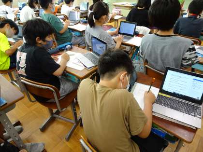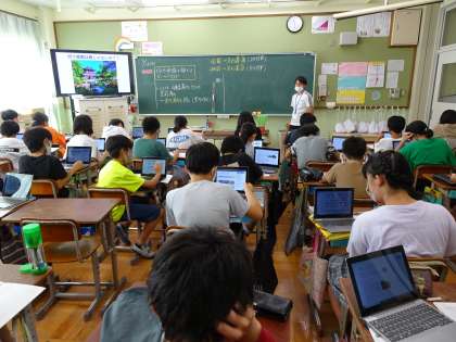 U田先生の視線の先には、6年生が一生懸命にタブレットや資料を調べている姿があります。
