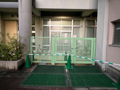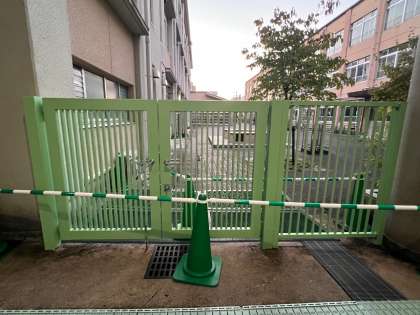 用務員さんが一生懸命に緑の門をペンキで塗りなおしてくれています。ドアノブや鍵の部分などは、細かいところまでしっかりと養生してからペンキを塗ってくれています。作業がとても丁寧です。