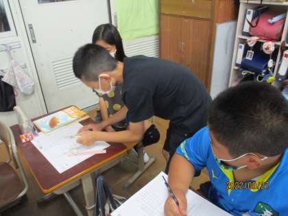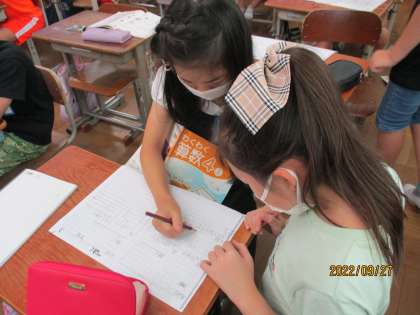 算数の学習では「わり算の筆算」を学習しています。分からなくて困っているお友達に、丁寧に計算の仕方を教えてくれているミニ先生が沢山います。教えてもらった人からは「なるほど!」「できた!」などの声が聞こえてきます。みんなで頑張っている姿が見られました。