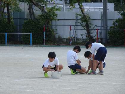 運動場にどうして給食の食缶が置いてあるのかと思ったら、小石を集めるために、使わなくなった給食の食缶を利用しているのですね。