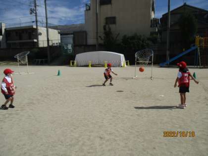 今日はチーム、ルールを確認、コートを作ることを頑張りました。ゴールを運んだり、ゼッケンを運んだり、コーンを運んだり、みんな協力して準備することができました。