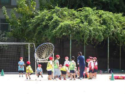 1ねんせいのみんなが体育でパスゲームの学習をしています。先生からゲームの進め方について教えてもらっています。みんな、しっかり聞けています。1ねんせいのみんな、かっこいいよ!!!