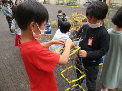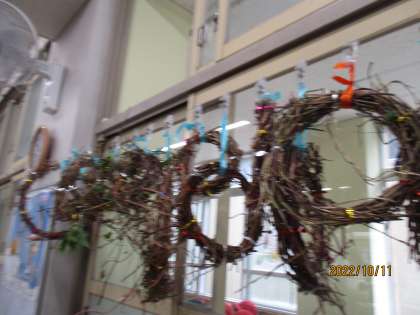茎とつるを使って朝顔のリース作りをしました。まだ茎が柔らかい間にくるっと一まとめにし、しばらく干して乾燥させます。丸い形に変身した朝顔を見て、みんな大喜びでした。秋見つけでどんぐりをたくさん見つけて、素敵なリースに仕上げます。