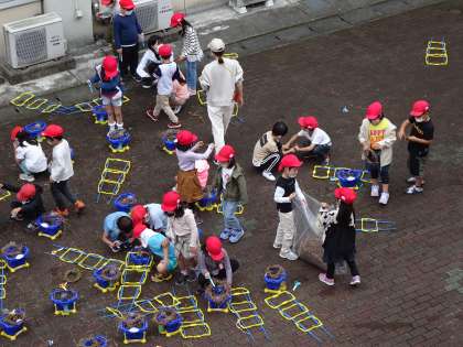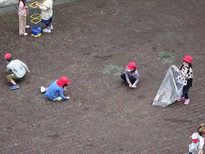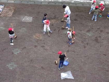 学習の終わりころには、あさがおのつるや葉っぱが中庭に散らかっています。でも、1ねんせいのみんながいっしょうけんめいにそうじをしてくれています。