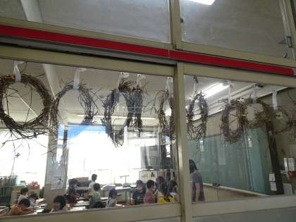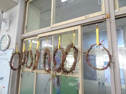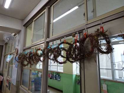 10月12日に1年生が生活科「さかせたいなわたしのは」の学習であさがおの茎とつるを使って、リース作りをしていました。1年生のみんなががんばってつくったリースが、教室の横に大切に飾ってあります。