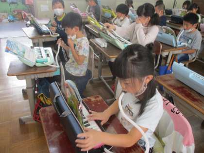 2拍子や3拍子の違いを,歌ったり,リズム打ちをしながら感じています。「虫の声」や「この空とぼう」など鍵盤練習にも取り組んでいます。