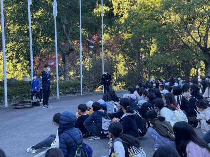 7時45分から朝のつどいです。玄関前の広場に集まっています。みんな元気そうな、いい表情をしています。