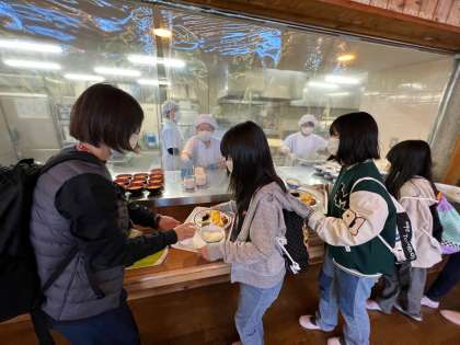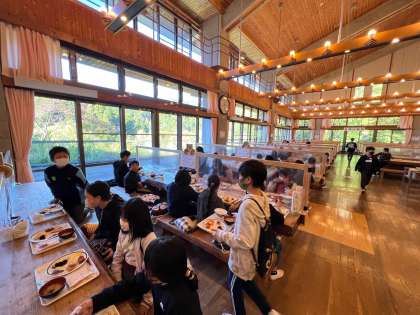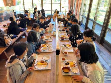 今日の朝食は、パンかご飯、スープかみそ汁どちらか選びます。朝食もしっかり食べて、2日目も元気に活動できるようにしましょう。