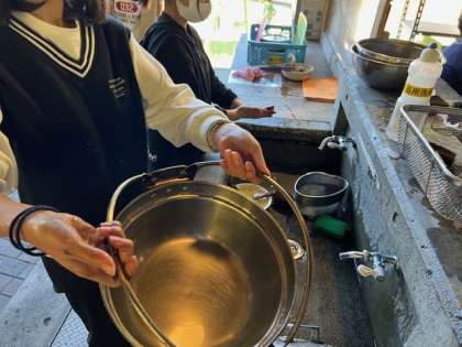 お皿や鍋を全て洗ったら、カゴの中に片付けます。カゴを山の家の先生にチェックしてもらい、合格なら炊飯用具倉庫に片付けられます。でも、チェックで合格しなければ、もう一度丁寧に洗わないといけません。さあ、一回で合格になるかな?