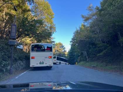 5年生を乗せたバスは、山道をゆっくり安全運転で走っています。