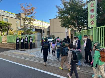 10月26日(水)の朝、正門前に10人くらいのスーツを着た方々が「おはよう」と言って児童を迎えてくれていますよ。先生かな?