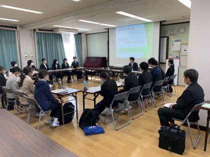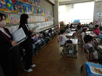 スーツを着た若い先生のような方々は、京都教育大学の学生のみなさんでした。小学校の授業をみたり、校長先生の話を聞いたり、先生になるための勉強をしに深草小学校にきていたのです。