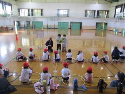 呉竹総合支援学校のお友達が来て一緒に体育の学習をしました。自己紹介をしているところです。