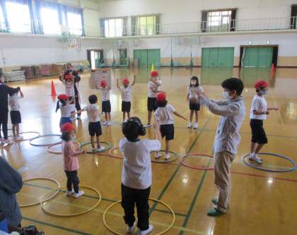 自己紹介の後はラジオ体操をしました。お友達が来てくれてうれしくて,前でラジオ体操をする子たちがたくさんいました。