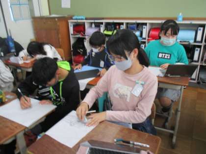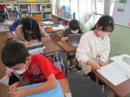 図工では版画の学習にはいりました。今回は建物をほります。細かいところまでよく見て下書きをしています!!