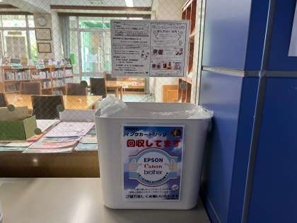 コミュニティプラザ深草図書館の入り口横にも、「インクカートリッジ(ベルマーク)」の回収箱があります。この度、PTA本部の担当の方が、新しい回収箱を設置してくださいました。