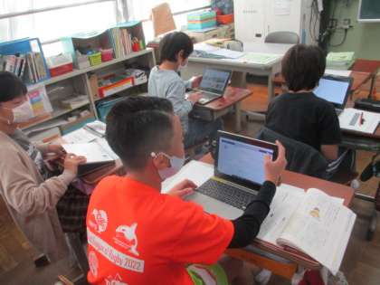 パンフレットやGIGA端末を使って、京都の伝統工芸や、全国の伝統工芸について調べています。