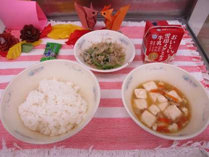 11月4日(金)の献立は、ごはん、牛乳、鶏肉ととうふのくず煮、もやしのごま煮、黒糖でした。