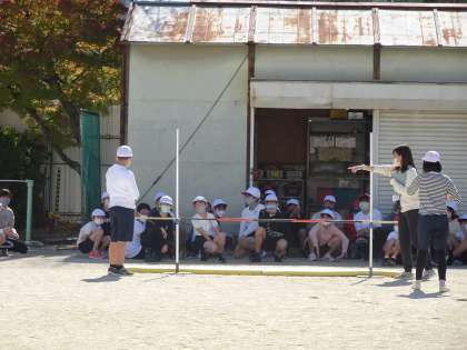6年生が体育で「走り高とび」の学習をしています。はじめに先生から、リズミカルな助走から力強く踏み切って飛ぶ方法を教えてもらっています。