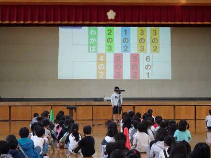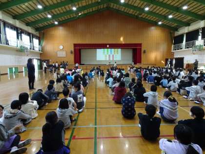 今回は,2グループ(わかば、1−2、2−3、3−2、3−3、4−2、5−2、5−3、6−1)が体育館での参加、他の学級は教室でオンラインで参加しました。