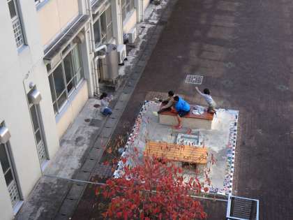 校内を歩いていると、授業中にも子どもたちが「かまどベンチ」を活用してくれている姿が見られました。タブレットで写真を撮っているようですね。何の学習かな?