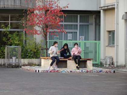 中間休みにも、「かまどベンチ」で友だちとゆったりとした時間を過ごしています。何をはなしているのかなあ?