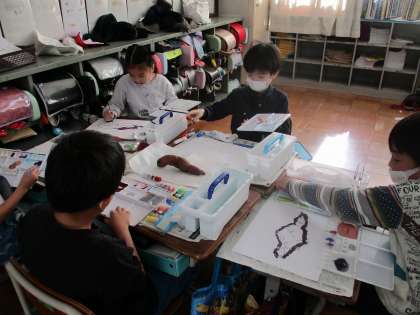 生活科で春に植えたサツマイモの苗が育ち,収穫時期を迎えました。全部で約70個ほど出来ました。サツマイモをじっくり見て絵の具で色付けをした後,サツマイモを見て感じたことを言葉で表しました。