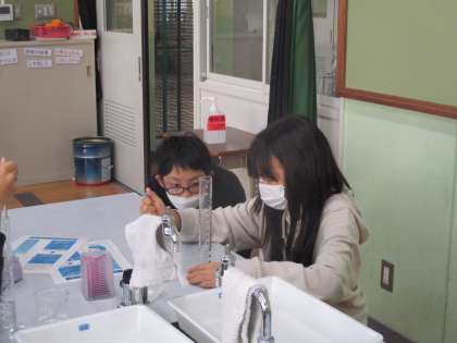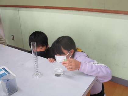 水面のへこんだところを横からまっすぐ見て,スポイトを上手に使いながら調整することができました。