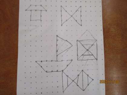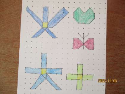 算数の学習では色板を使ったり、数え棒を使ったりしていろいろなかたちを作る学習をしています。また、点と点を結んでいろいろなかたちも作ってみました。点を決めて、線で結ぶと・・・いろいろな形が出来上がりました!「星を作ってみた!」「数字もできるよ!」とみんなとても楽しく学習していました。