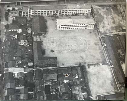 この写真は、いまから60年前の1962(昭和37)年の深草小学校の校舎と運動場を撮影したものです。1962年の児童数は、1,510名でした。2022(令和4)年の児童数が735名ですから、1962年当時は、いまの約2倍の数の児童が深草小学校で学んでいたことになります。