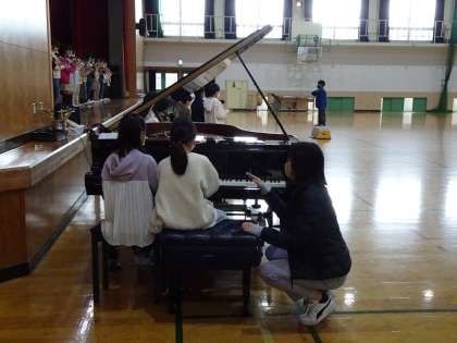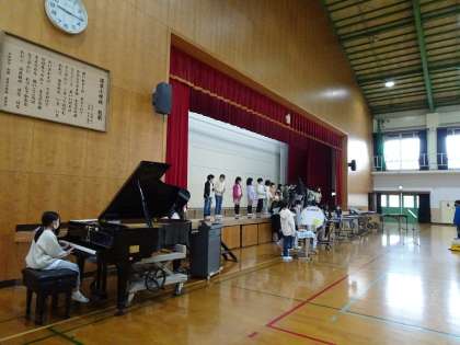 3年生が体育館で「音楽発表会」の練習をしています。みんな真剣な表情で演奏しています。担任のY川先生、音楽専科のH詰先生、学年のN田先生の指導にも力が入ります!