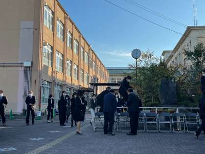 教職員がどうしてみんな集まって来てるのかって・・・それは、今日は卒業アルバムの教職員のページの写真撮影をしているからです。