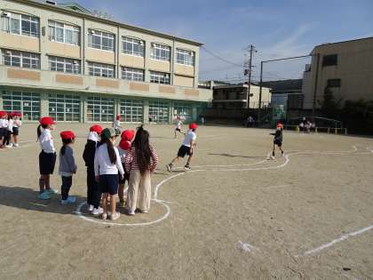 11月17日(木)1校時 1年・体育「じんとりあそび」ドン・ジャンケン・・・ルールがわかったかな?