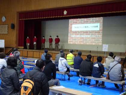 体育館では、かまどベンチ制作に協力してくれた京都工学院高等学校の生徒さんが、『「かまどベンチ制作」への挑戦』を発表してくれました。