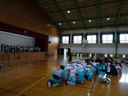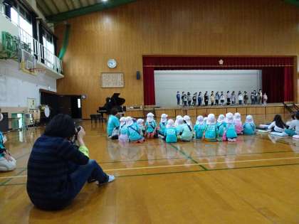 3時間目、深草幼稚園の年長さんが、1年生の音楽発表会の体育館での練習を聴きに来てくれました。本当は25日(金)の本番に来てもらえるとよかったのですが、幼稚園の行事もあって本番は来てもらえないということで、練習の様子を見てもらいました。