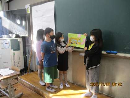 国語の学習で,1年生に本を好きになってもらうための読み聞かせをするために,話し合いをたくさんしました。大きな声でハキハキと読み,1年生の子どもたちは,釘付けでした。
