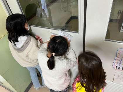 12月5日(月)お昼休み たくさんの子どもたちが、壁に向かって・・・何をしているのかな?