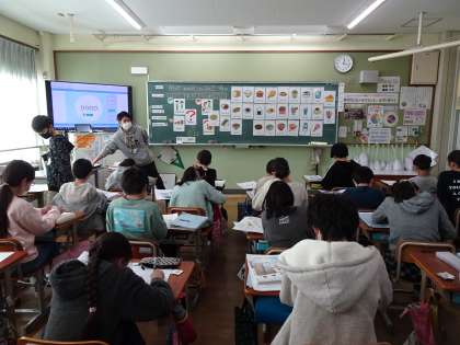 4時間目、5年2組のみんなは、教室でM地先生と英語の学習をしていました。子どもたちは一生懸命に「レストランでねだんをたしかめて注文しよう」の学習をすすめています。