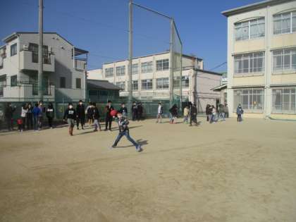 クラスみんなで外で元気よく遊ぶことはとても良いことです。男子女子関係なくガンガン投げています。