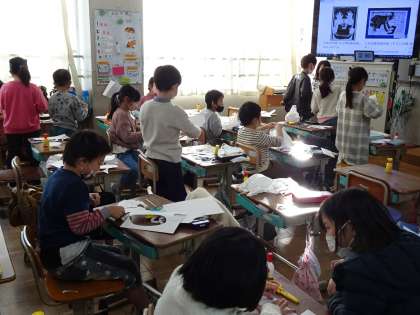 12月8日(木)5校時 2年・図画工作「たのしく うつして(紙はんが)」どんな作品ができるのか、楽しみです!